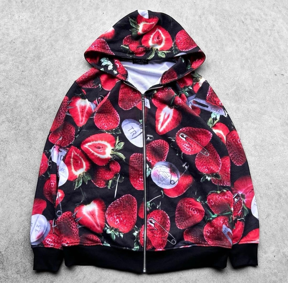 美品 TRAVAS TOKYO トラバス トーキョー 総柄 地雷系 ストロベリー柄 フルジップ スウェット パーカー の出品になります!