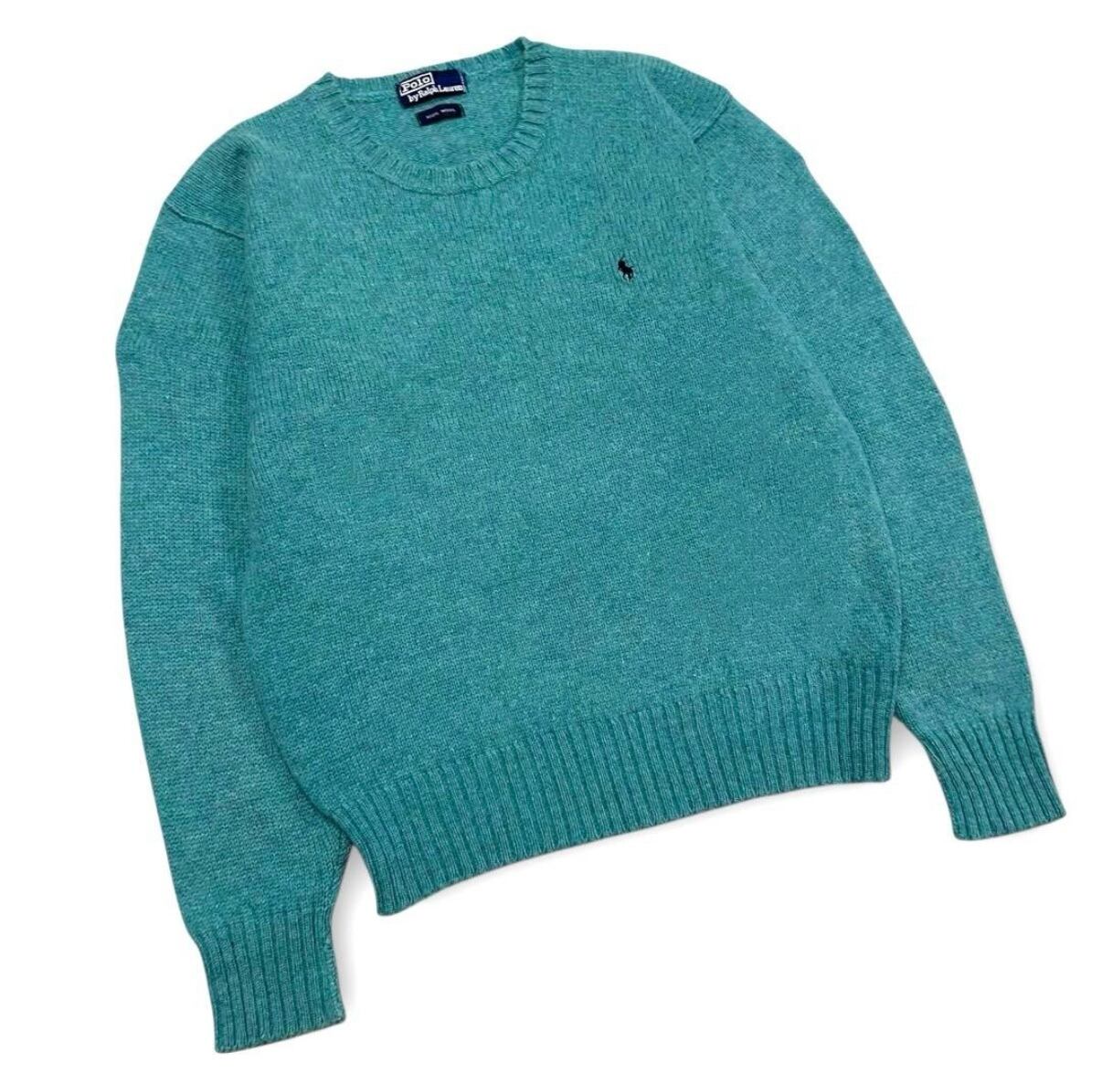 美品 90s ラルフローレン ウール100% ターコイズ 刺繍ロゴ ニット